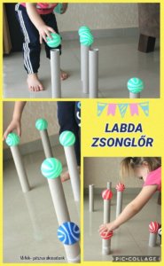 Nagyobbaknál – ha több szinű labdánk is van otthon- nehezíthetjük a feladatot színválogatással is.🤹♀️ (Csak az megadott színű labdákat rakhatja fel. )